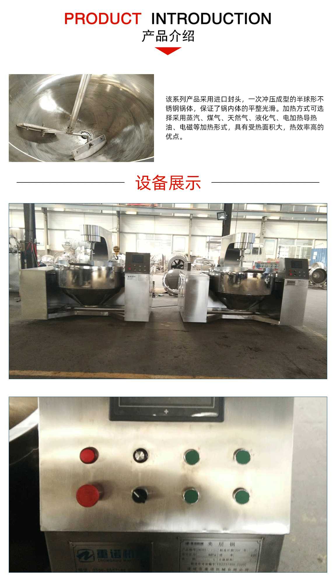 搅拌方式采用特殊的倾斜式行星传动,使用的搅拌器与锅体达到充分接触,实现传动公转与自转的不整数传动比,确保国内无搅拌死角,物料搅拌均匀不粘锅。广泛应用于火锅底料炒制,肉类加工,莲蓉、酱料、调理食品以及日用化工,制药行业的搅拌结合,以及用于肉制品,炒馅、酱料、调理食品、糖果、制药、乳品、饮料、罐头等食品行业加工,也可用于团膳、大型餐厅或食堂的的炒菜、熬粥、卤制品等之用。