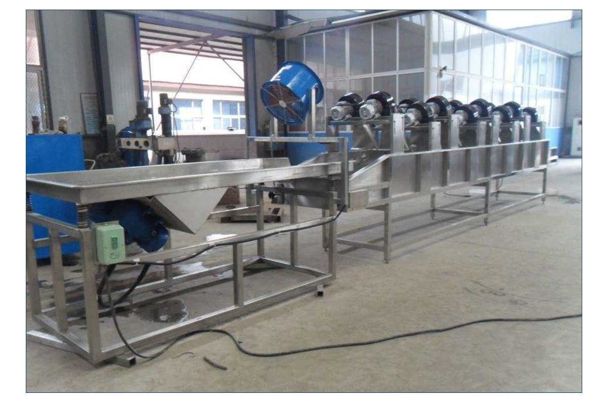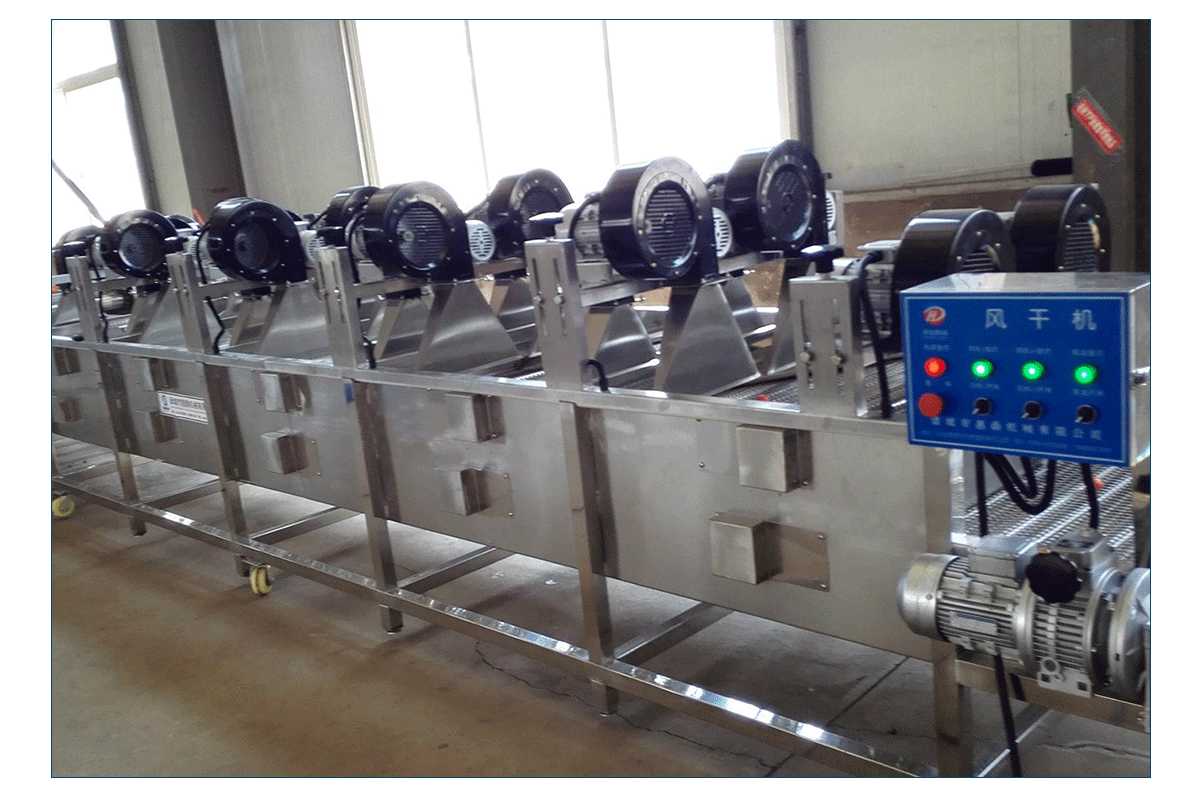 3. 风干机除水后可直接装箱,风干机实现连续作业(与连续工作杀菌机配套使用),只需将杀菌后的产品放入输送网带,经风干机产生的气流经喷嘴喷射而出,吹干风温为常温,风干机有效保护物料本身的色泽和品质。从而达到包装除水、除油渍、水垢等效果,即可装箱入库。
