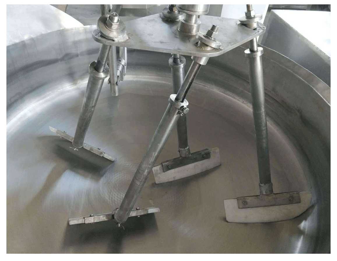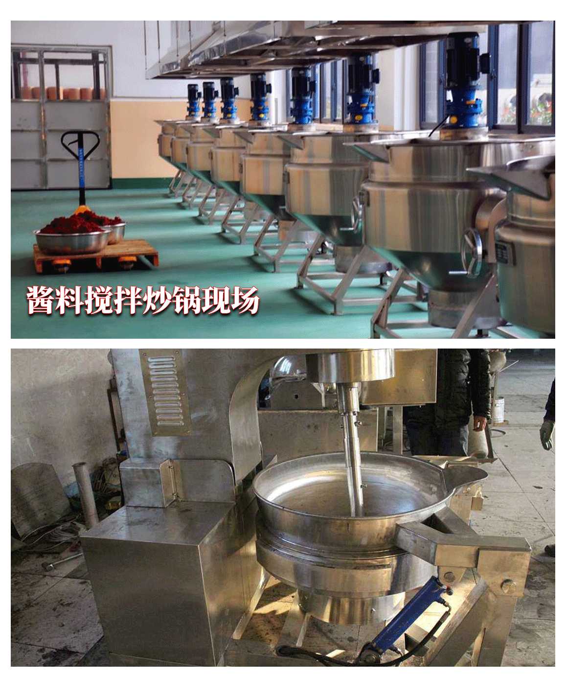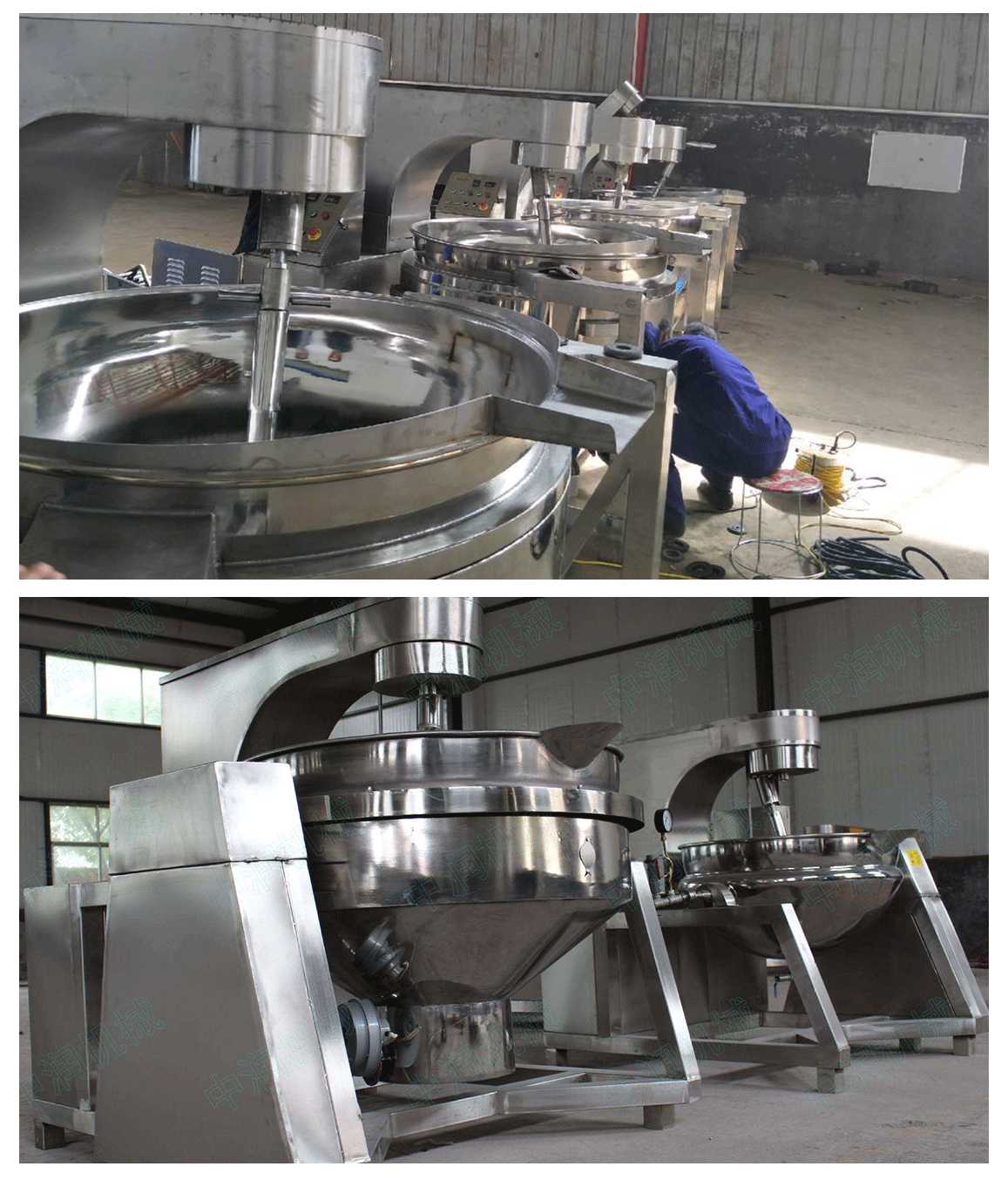 行星搅拌炒锅体为一次冲压成型的半球形不锈钢锅体,采用蒸汽、液化气、天然气等加热形式,搅拌方式采用特殊的倾斜式传动,使用的行星式搅拌器与锅体充分接触,实现传动公转与自转的不整数传动比,使锅内无搅拌死角。使用先进的传动与密封结构,使传动部分与锅内洁净、卫生。采用变频调速动力,运行更平稳。另本机采用液压升降,翻锅运料,免拆装搅拌器,节省人力,降低劳动强度,是性能优良的食品加工设备。