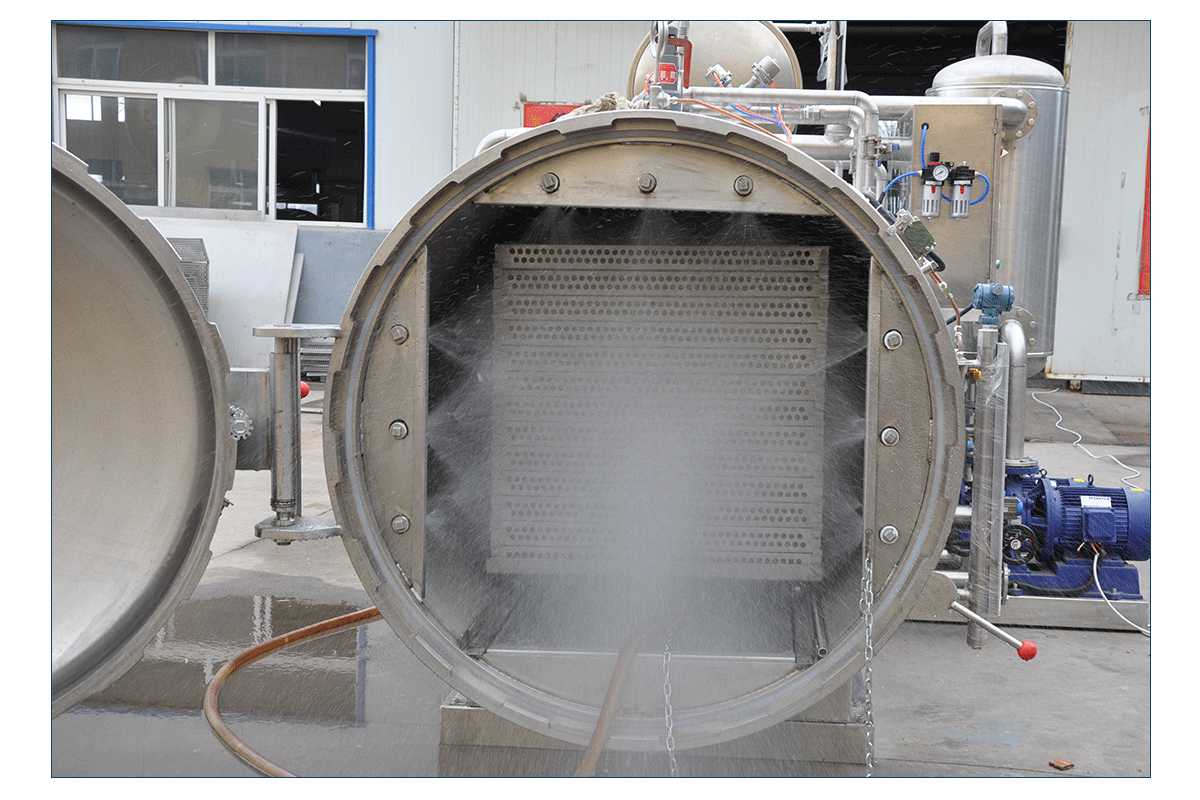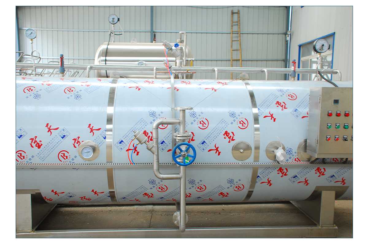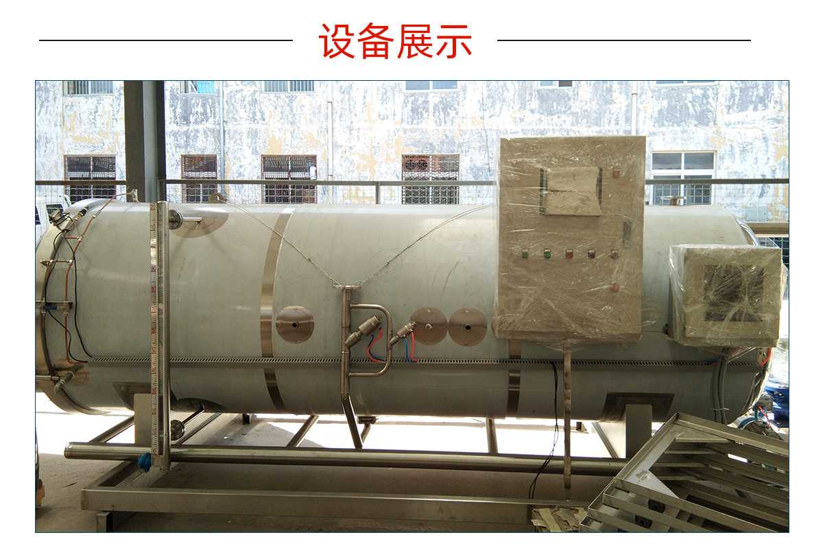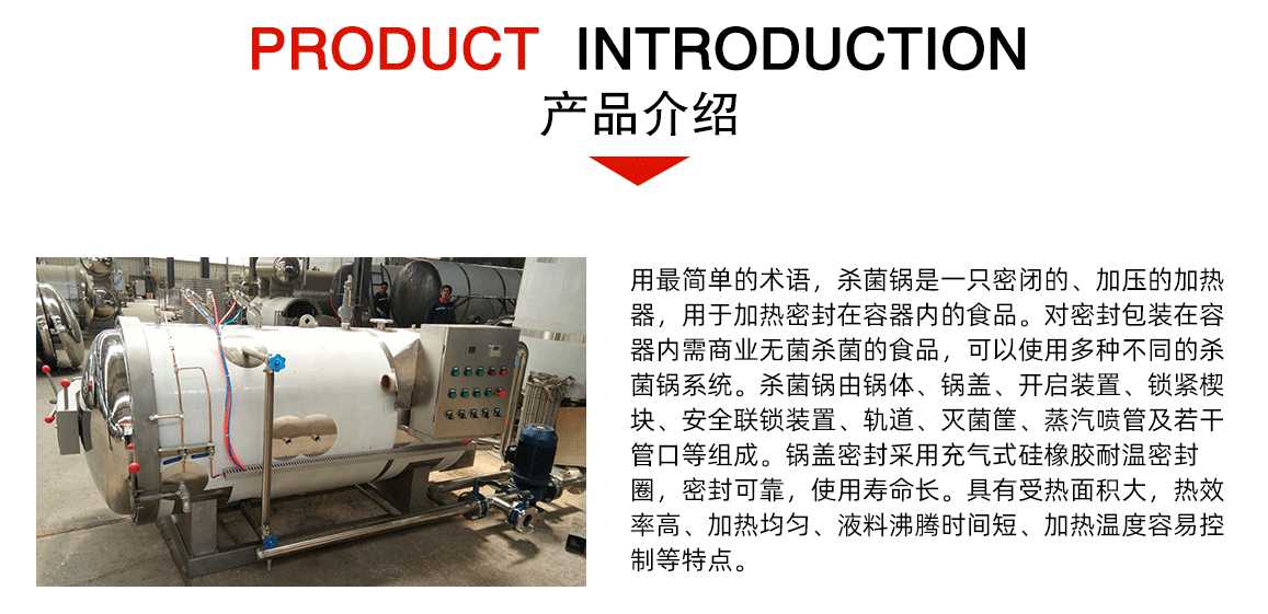 一般罐头食品厂对罐头作常压水煮加热杀菌处理时都采用本形式的卧式杀菌锅,本设备通过引入压缩空气可实现反压杀菌。如冷却需在锅内进行,须用水泵打入锅顶部的喷水管(或采用水循环系统)。