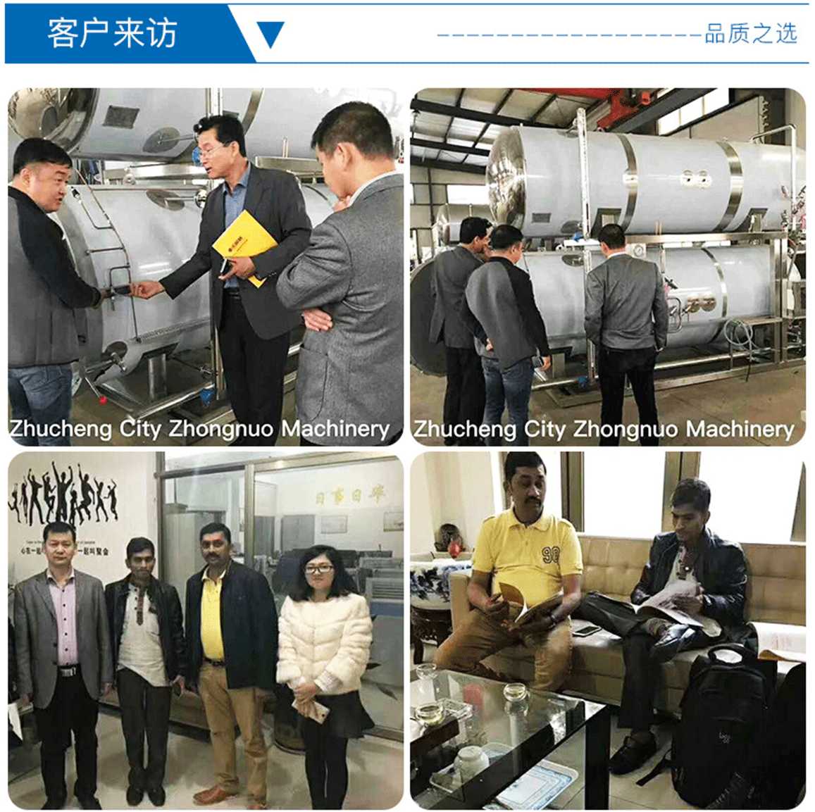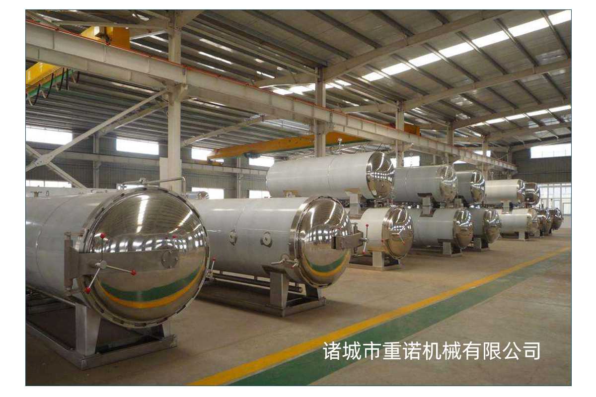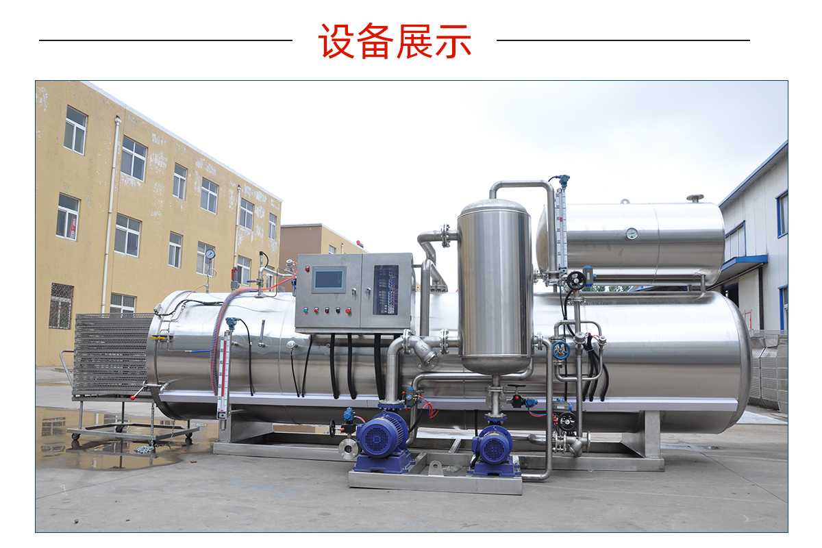 一般罐头食品厂对罐头作常压水煮加热杀菌处理时都采用本形式的卧式杀菌锅,本设备通过引入压缩空气可实现反压杀菌。如冷却需在锅内进行,须用水泵打入锅顶部的喷水管(或采用水循环系统)。