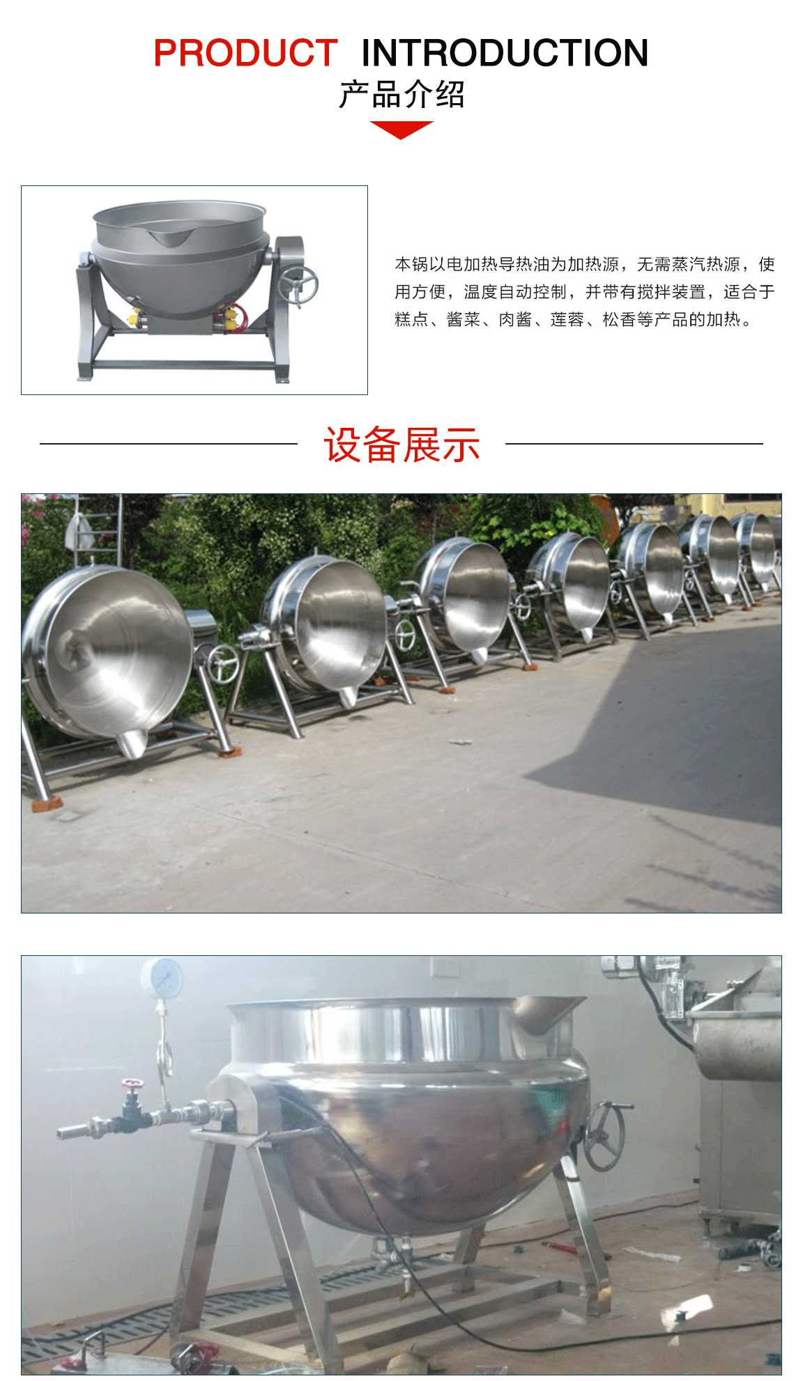 2.结构形式:分为可倾式夹层锅、立式(固定)夹层锅结构,按工艺需要各采用带搅拌或不带搅拌设备。